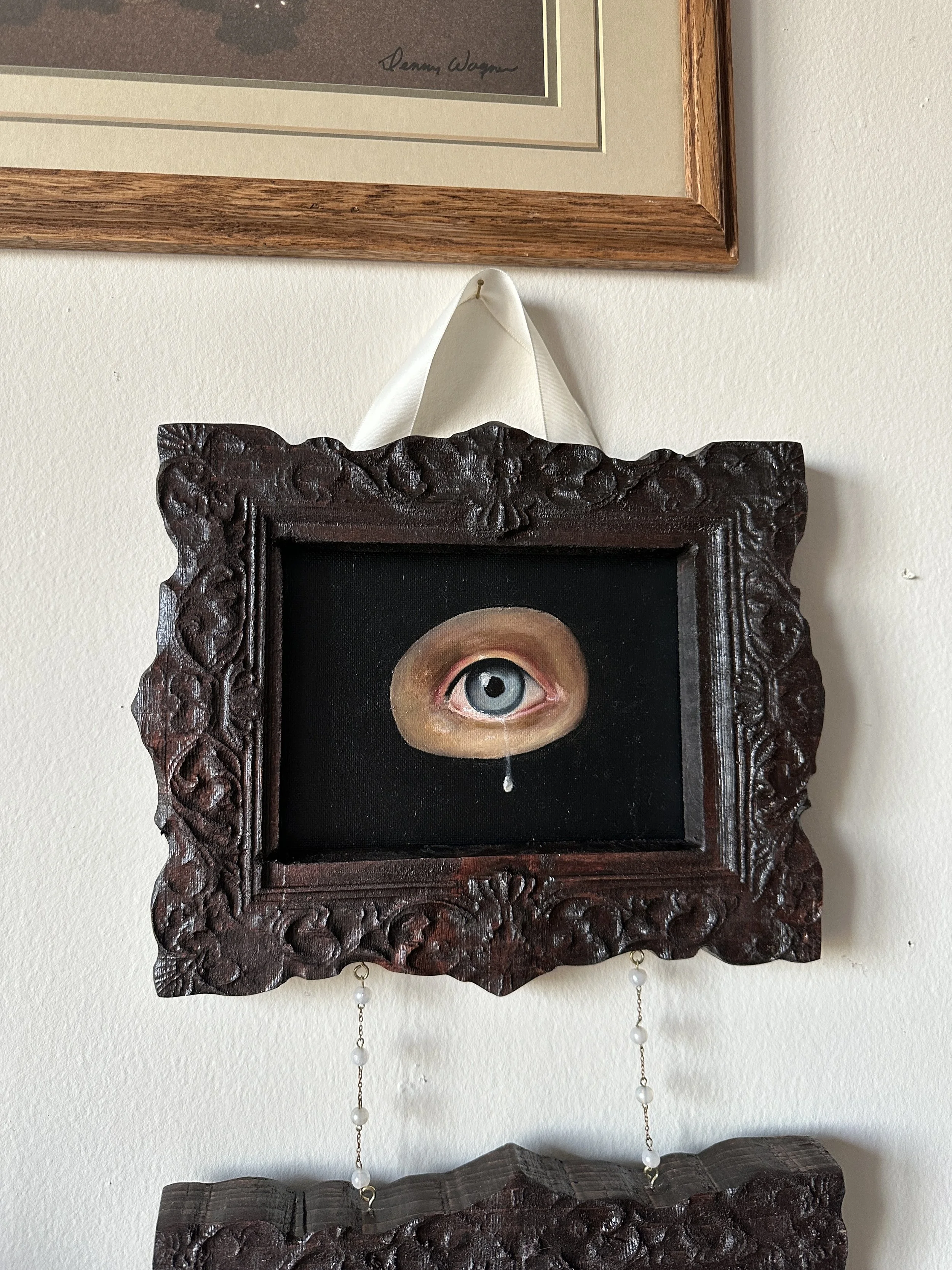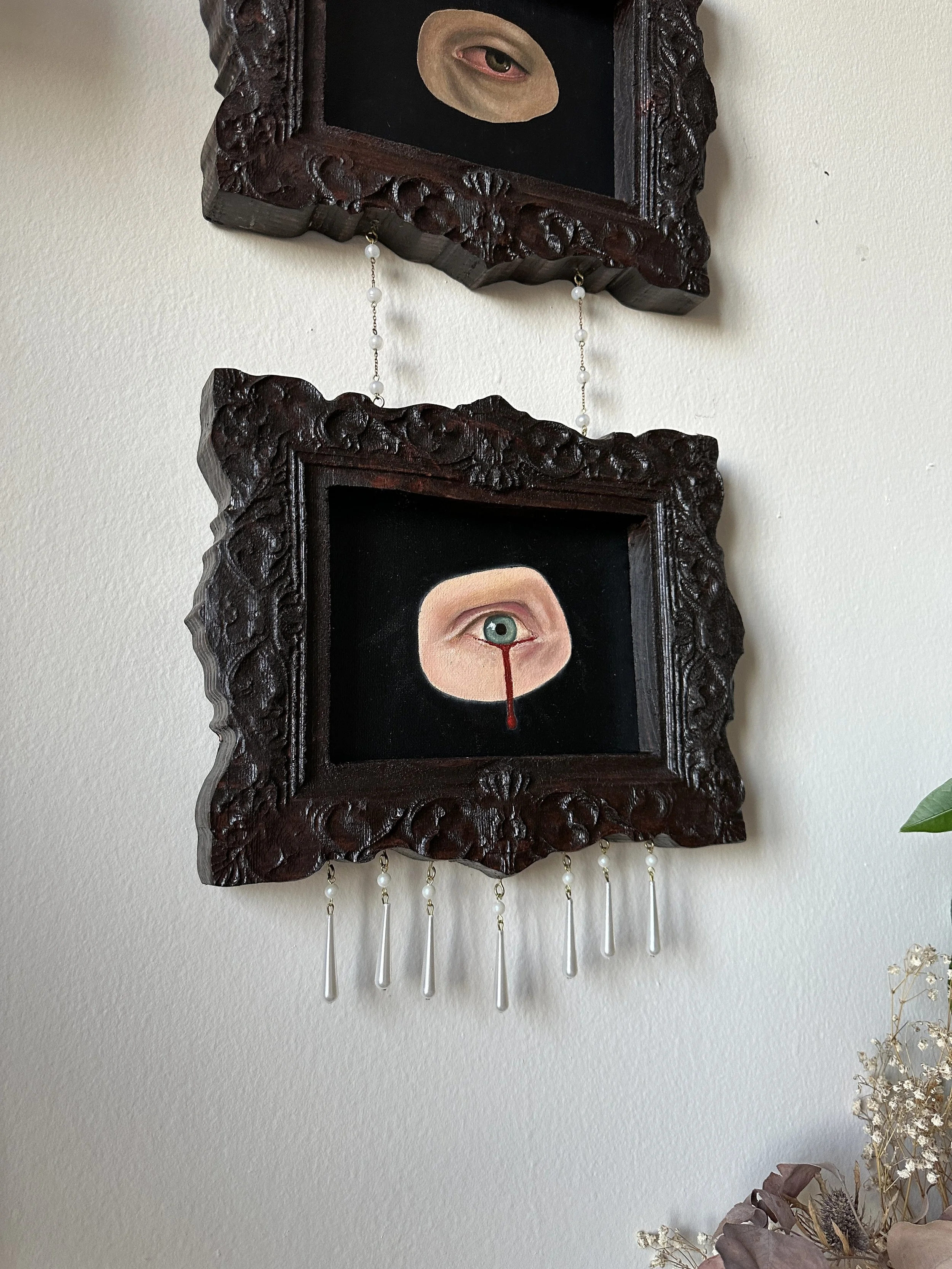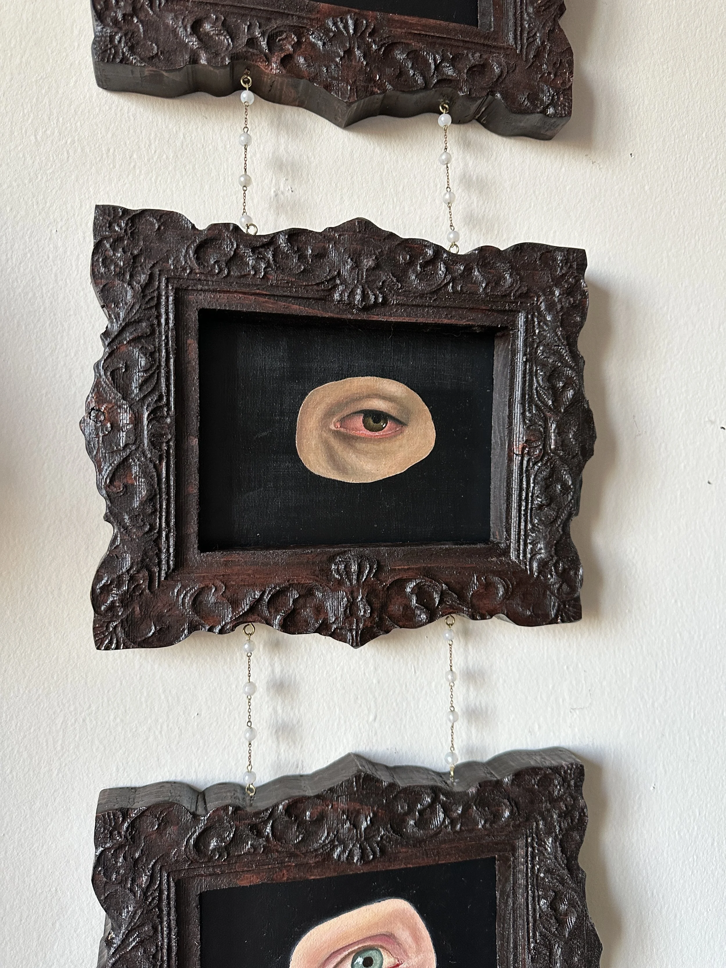 Oil on Canvas, Handmade frames, vintage pearls on brass chains